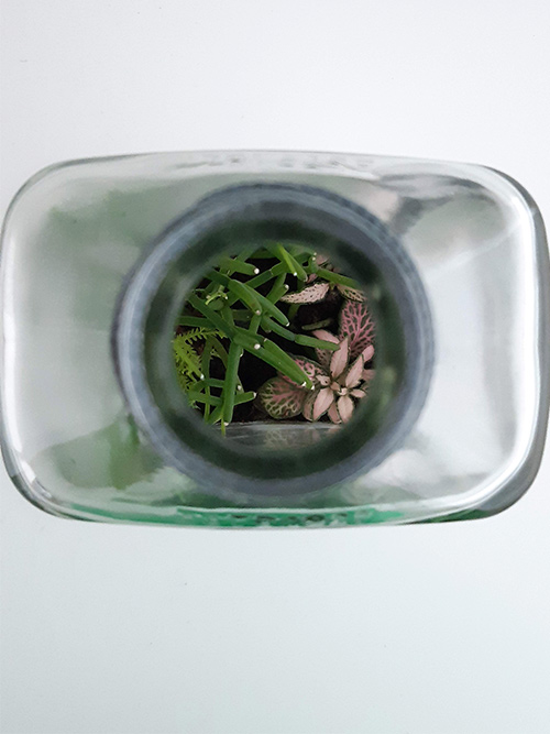 Hutan feita em uma linda garrafa de whisky de 1l, com fitônia e suculenta.